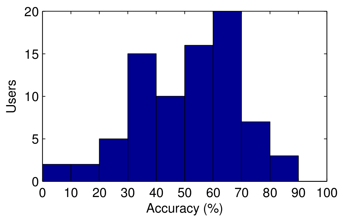 When I got my first results, I was quite surprised to learn how predictable people are. On average we could predict the next place of a person with 53 % accuracy. This is pretty good given that the average number of different places per person was 51 so if you were to throw your 51-sided dice, you could have expected an accuracy of only about 2 %. Quite interestingly, the predictability varied a lot from person to person. Below you can see the distribution of the accuracies we obtained for different people. While some people were very hard to predict, there was one individual whose next place the model was able to predict with an 86 % accuracy!