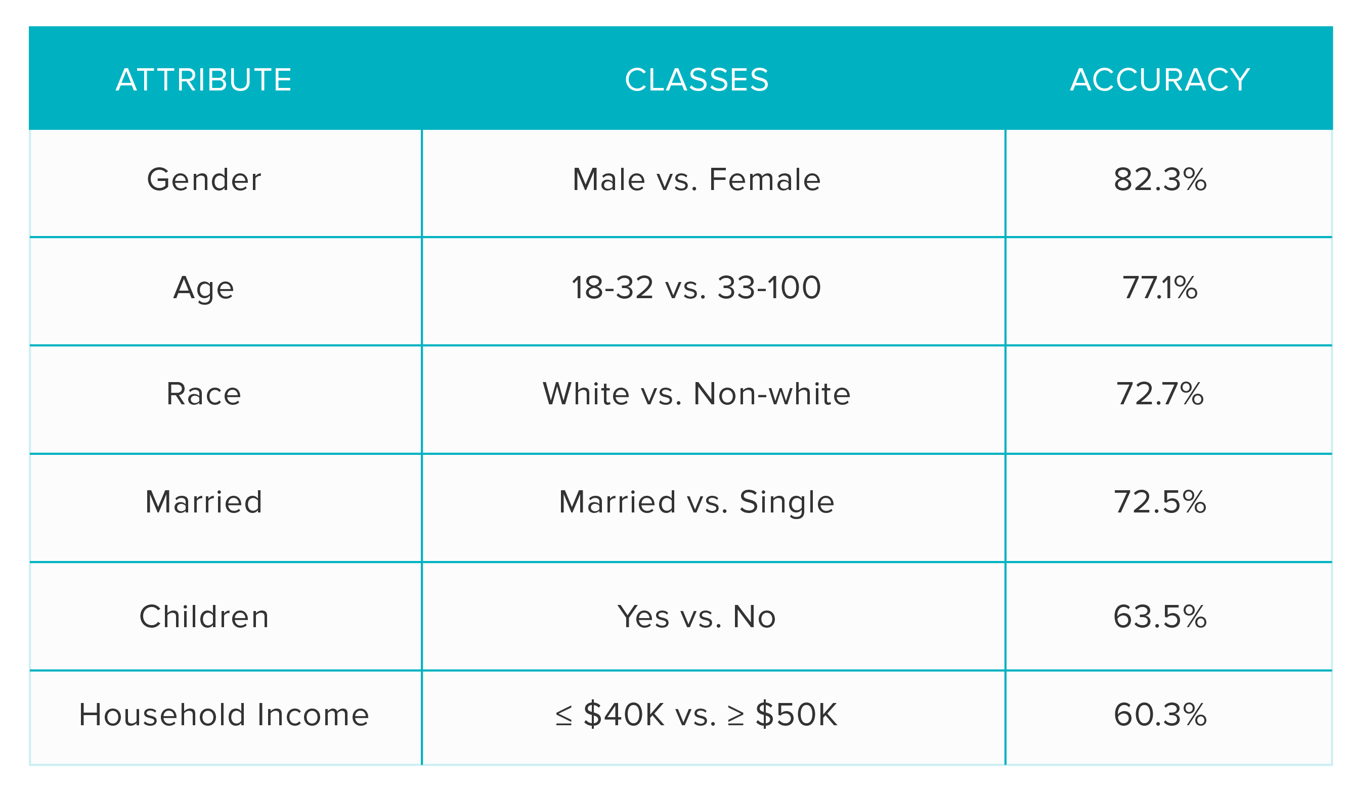 To study the predictability of different demographic attributes, we binarized each of them and solved the resulting classification problems employing logistic regression. The results are shown in the table below.
